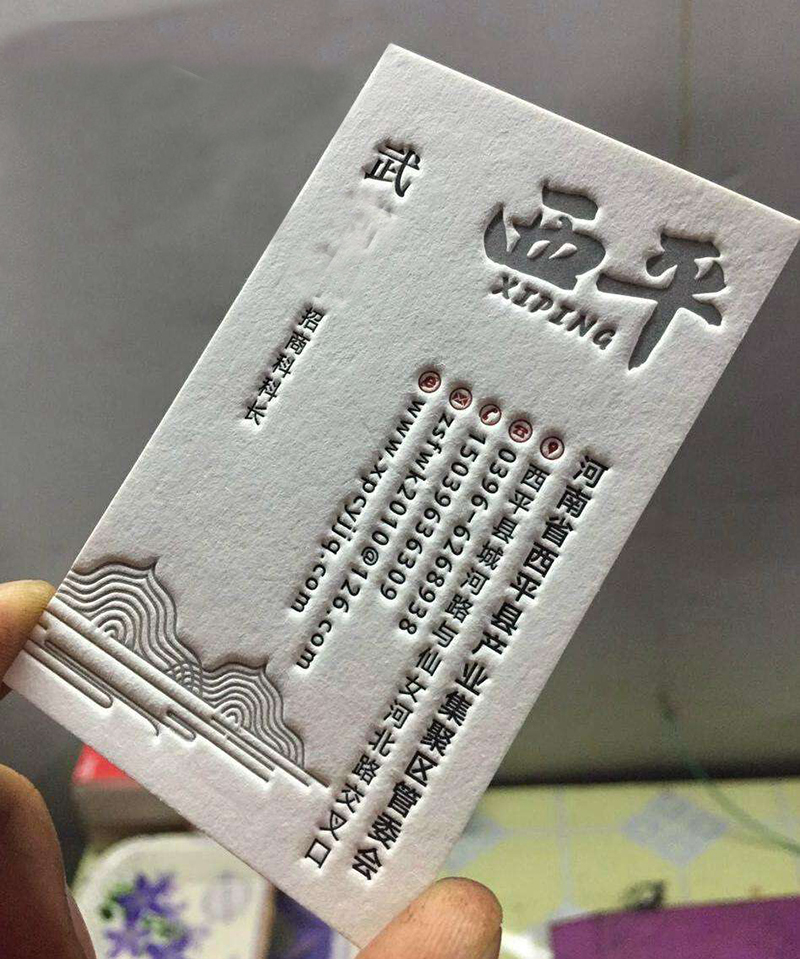 ???????這次要介紹的是擊凸名片,也可以稱作浮雕名片。這類擊凸名片多采用凹凸銅板或電雕制版工藝,通過壓印、散粉、加熱、冷卻及后加工工序等方式制成??蔂C金、可上粉(水晶名片),多采用不同的特種紙來制作名片,以凸凹字為主,亦可花紋浮雕,使得名片生動美觀,富有立體感。上手觸感明顯,簡約而不簡單,是高檔名片的代表之一。具有濃濃的商務(wù)風,藝術(shù)風。特別適合經(jīng)貿(mào)商務(wù),上層社交,藝術(shù)設(shè)計人士使用。