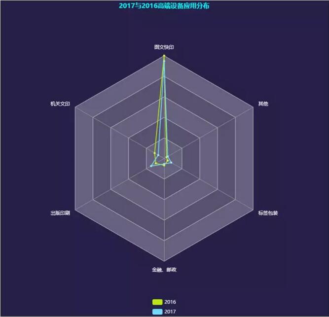 到2017年7月,單張紙高端彩色數(shù)字印刷設(shè)備(圖中綠柱)裝機(jī)總量達(dá)到2096臺(tái),在上年度的基礎(chǔ)上增加了271臺(tái),增長(zhǎng)率接近15%,比上年度的增長(zhǎng)率增長(zhǎng)了3個(gè)百分點(diǎn),是近三年中新增量最高的一年。
