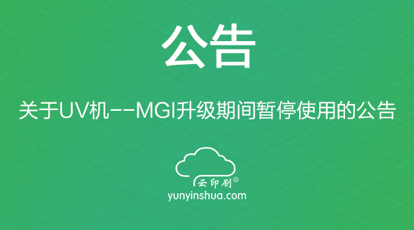 ? ? ? 您好!云印刷生產中心的數碼UV機-MGI將于2017年11月20日14:00起至2017年11月27日進行軟件系統和硬件設備升級,升級期間將暫停使用。在此期間所下訂單延后至11月28日統一安排生產,屆時可能造成短暫的發(fā)貨滯后現象,如給您造成不便敬請諒解!
